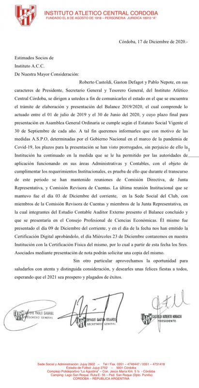 Roberto Castoldi, Gaston Defagot y Pablo Nepote, en sus caracteres de Presidente, Secretario General y Tesorero General, del Instituto Atlético Central Córdoba, se dirigen a ustedes a fin de comunicarles el estado en el que se encuentra el trámite de elaboración y presentación del Balance 2019/2020, el cual comprende lo actuado entre el 01 de julio de 2019 y el 30 de Junio del 2020, y cuyo plazo final para presentación en Asamblea General Ordinaria se cumple según el Estatuto Social Vigente el 30 de Septiembre de cada año. A tal fin queremos informarles que con motivo de las medidas A.S.P.O, determinadas por el Gobierno Nacional en el marco de la pandemia de Covid-19, los plazos para la presentación se han visto prorrogados, sin perjuicio de ello la Institución ha continuado en la medida que se le ha permitido por las autoridades de aplicación funcionando en sus áreas Administrativas y Contables, con el objeto de cumplimentar los requerimientos Institucionales, es prueba de ello que durante el transcurso de este periodo se han mantenido reuniones de Comisión Directiva, de Junta Representativa, y Comisión Revisora de Cuentas. La última reunión Institucional que se mantuvo fue el día 03 de Diciembre del corriente, en la Sede Social del Club, con miembros de la Comisión Revisora de Cuentas y miembros de la Junta Representativa, en la cual integrantes del Estudio Contable Auditor Externo presento el Balance concluido y que se presentaría en el Consejo Profesional de Ciencias Económicas. Él mismo fue presentado el día 09 de Diciembre del corriente, y en el día de la fecha nos han emitido la Certificación Digital aprobándolo, el día Miércoles 23 de Diciembre contaremos en nuestra Institución con la Certificación Física del mismo, por lo cual a partir de esta fecha los Sres. Asociados mediante presentación de nota podrán solicitar una copia del mismo.